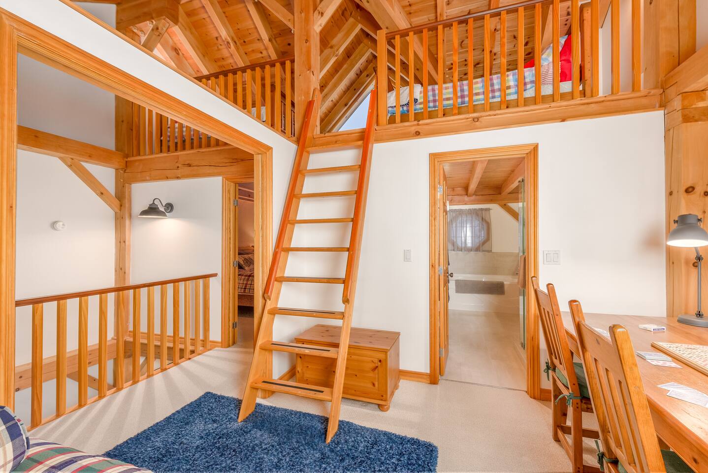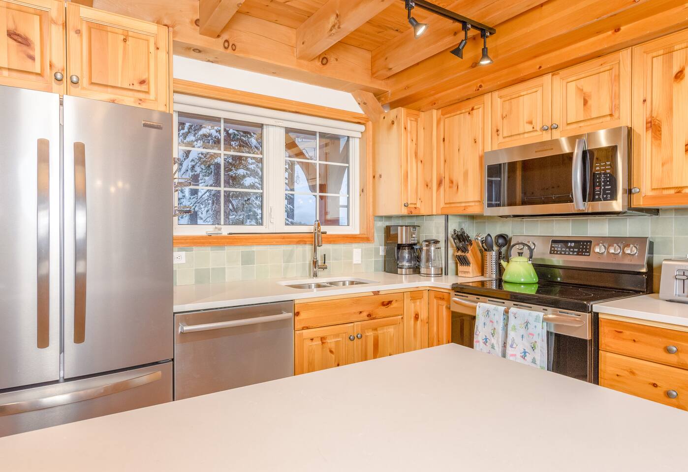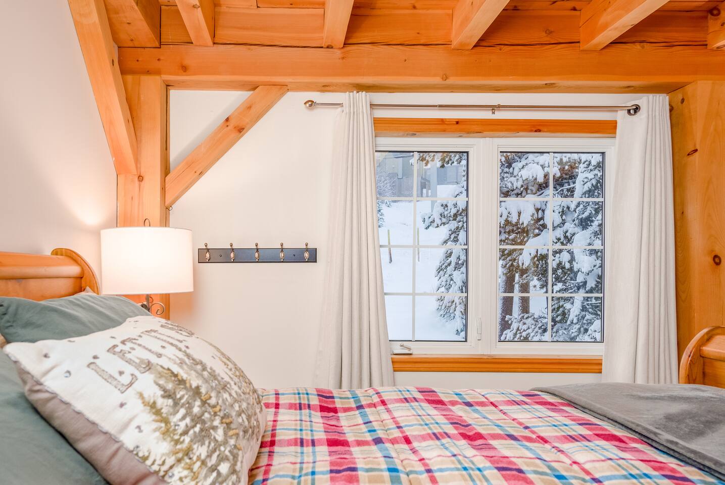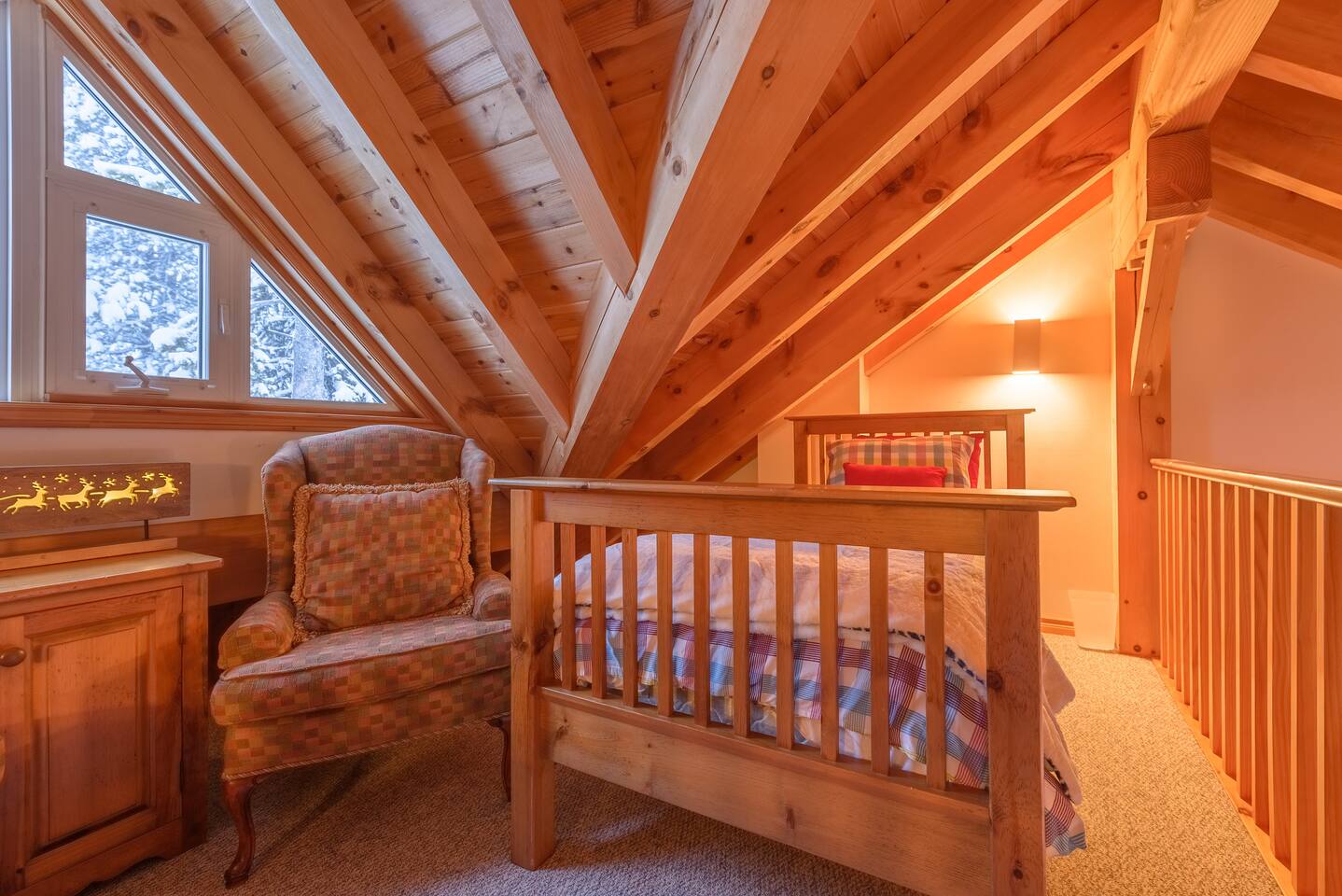 ✔ Cozy Ski-In Chalet – Timber-frame design with large windows, warm wood accents, and stunning forest views at Big White. ✔ Spacious Living Room – Two comfy sofas, gas fireplace, mounted TV, and soaring two-storey windows that fill the space with natural light. ✔ Reading Nook – A quiet corner with leather armchairs for relaxing, reading, or sipping your après-ski drink. ✔ Fully Equipped Kitchen – Stainless-steel appliances, cookware, dishes, coffee station, and everything needed for home-cooked meals. ✔ Dining Area – Solid wood table with seating for six, perfect for family dinners and board games. ✔ Private Hot Tub – Nestled outdoors among snow-covered evergreens for a peaceful, scenic soak. ✔ Bedroom 1 (Main Floor) – Queen sleigh bed, warm lighting, and easy access without stairs. ✔ Bedroom 2 (Main Floor) – Cozy room with timber accents and natural light—ideal for kids or a second couple. ✔ Primary Bedroom (Upper Level) – Lofty vaulted beams, spacious bed, and access to an updated walk-in shower bathroom. ✔ Loft Bedroom – Fun, treehouse-style space accessed by ladder, perfect for kids or teens. ✔ Two Updated Bathrooms – One with walk-in glass shower; one with tub/shower combo for families. ✔ Private Deck – Outdoor space for morning coffee or mountain sunset watching. ✔ Attached Garage – Excellent storage for skis, boards, and winter gear; sheltered parking when available. ✔ Ski-In/Ski-Out Access – Glide straight to the slopes when snow conditions allow. ✔ Multi-Level Home – Stairs inside and a loft ladder (may not be ideal for very young children or mobility concerns). Ski In/Out: ✔ Ski in via the Hummingbird Green Run pull off just below the Eagles Building and walk across the road to Alpine Timbers. ✔ Ski out by walking across the road to the Hummingbird Green Run which will take you to the bottom of the Ridge Rocket, Snow Ghost and Plaza chair lifts.