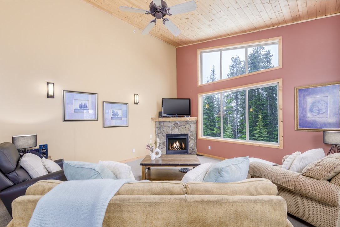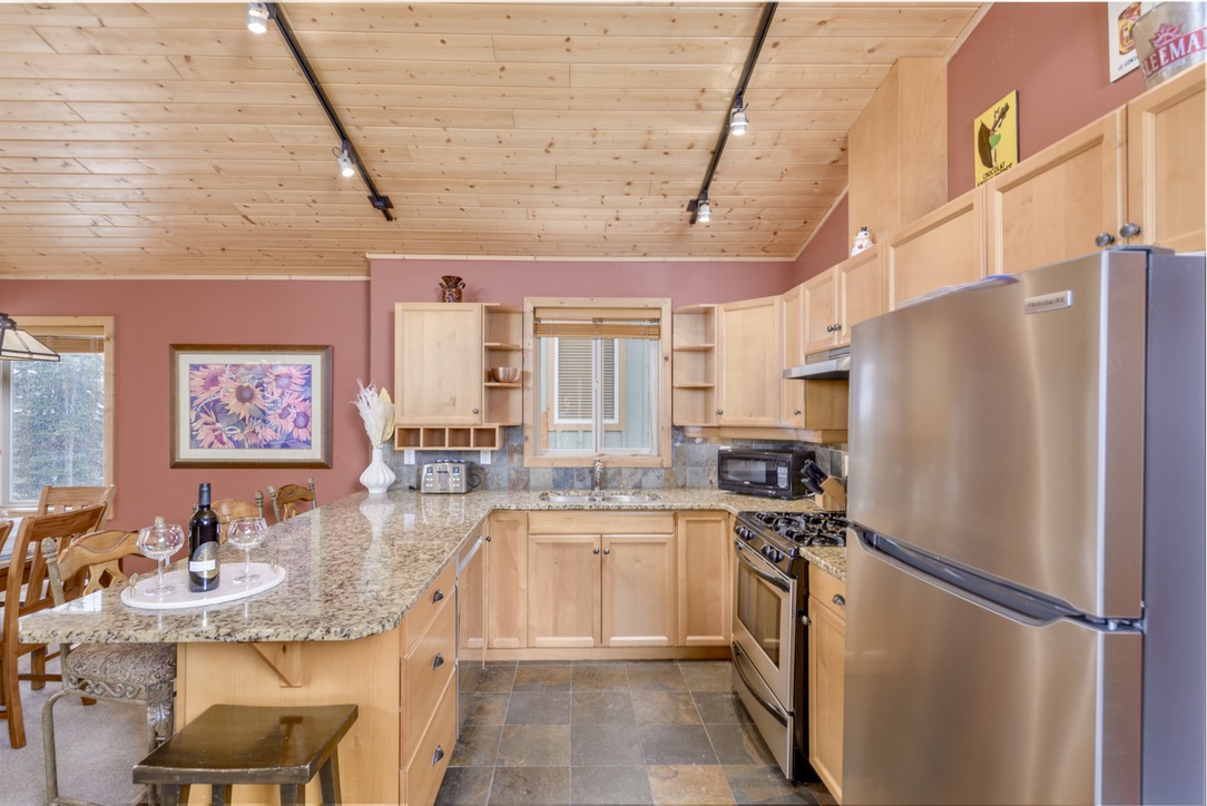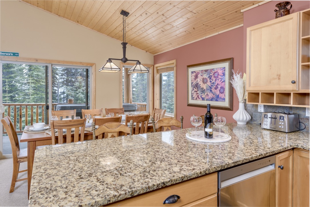 A stay at Silver Tip Chalet is a step into the ultimate in Ski in/Ski out accommodation here at Big White Resort! This 3 bedroom 2 1/2 bath chalet, comfortable sleeps 8 guests and features a large open floor plan for your family’s or groups enjoyment. Set in the quaint location of Upper Snow Pines Estates, our chalet is the ideal location for a large or extended family or 3 couples. Take in the expansive views of the Monashee Mountains with friends and family from the private hot tub on your back deck or the great room after a day of skiing or snowboarding. This true ski in/ski out chalet back onto Serwas run that will take you down to the Ridge Rocket, Snow Ghost, or Plaza lifts. Walk out our back door and you are directly on Serwas run. Our kitchen is well appointed with most of the conveniences of home to make your stay more enjoyable and able to prepare your own meals with your family or friends and you are directly on the “Snow Pines to Village pathway where you’ll discover a number of premium restaurants, pubs and cafes to tantalize your taste buds or some shops for the kids and adults alike.. Views from our chalet are endless. Weather you are enjoying time in front of the fireplace or sitting in the hot tub and enjoy some of the most expansive views out to the Okanagan Highlands and Monashee Mountains, you will love this chalet! Your stay includes free parking for two vehicles, one in a heated garage, an in-suite laundry, free WIFI and a gas BBQ. You are provided with our exclusive bath amenities (Treatments shampoo, conditioner, luxurious hand cream, cold cream bath bar) for your enjoyment. You are also provided coffee, salt, pepper, tin foil, stretch wrap, zip lock bags, coffee filters, dishwasher soap, dish hand soap, laundry soap and some household cleaners to help you clean up during your stay. Cleanliness is extremely important to us, hence we only use BCHA approved procedures and products to ensure your home away from home is disinfected and clean! Your stay at Silver Tip Chalet at Big White, will create some lasting memories for your family or group till your next visit where you’ll make even more memories.