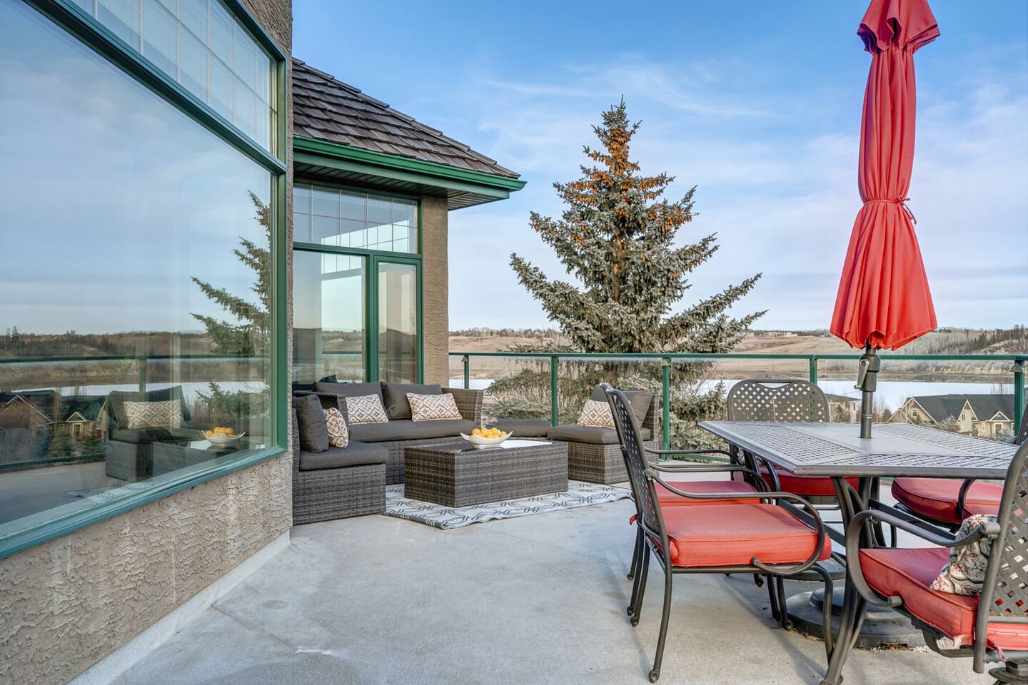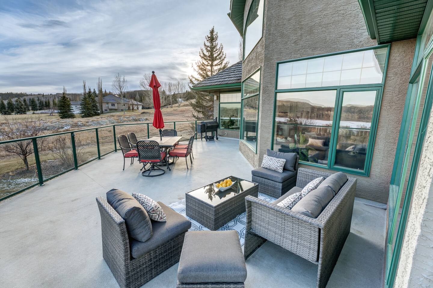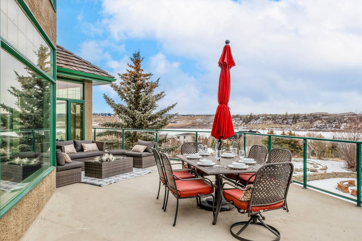 The entire space is available for guests including the backyard, patio, fire pit, hot tub and sauna. The backyard overlooks Springbank Links golf course with a view of Bow River.