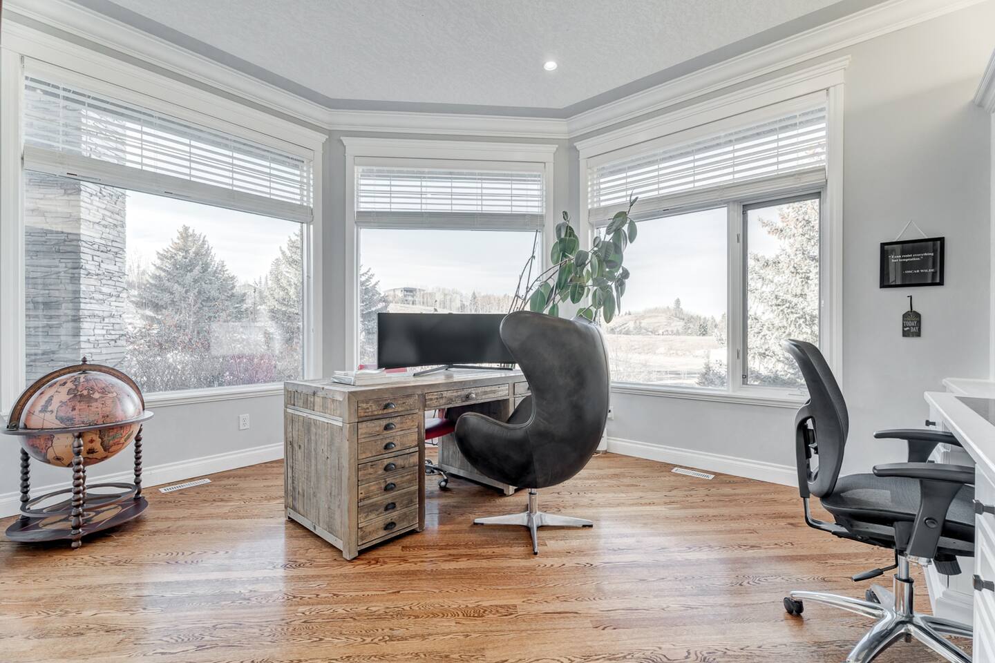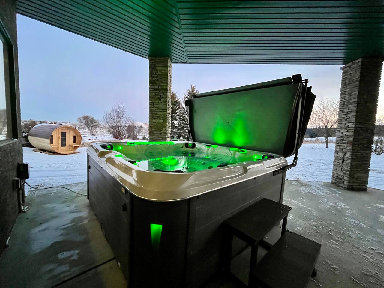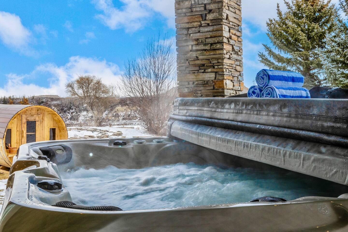 The entire space is available for guests including the backyard, patio, fire pit, hot tub and sauna. The backyard overlooks Springbank Links golf course with a view of Bow River.