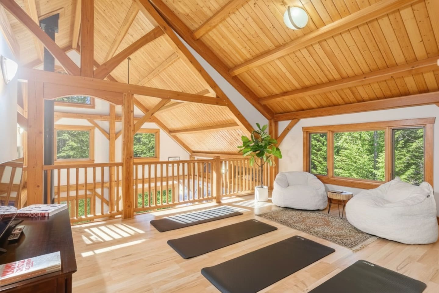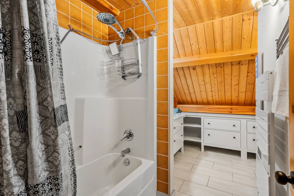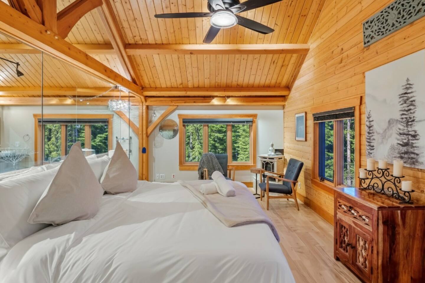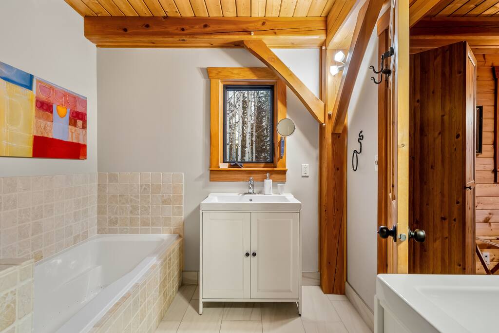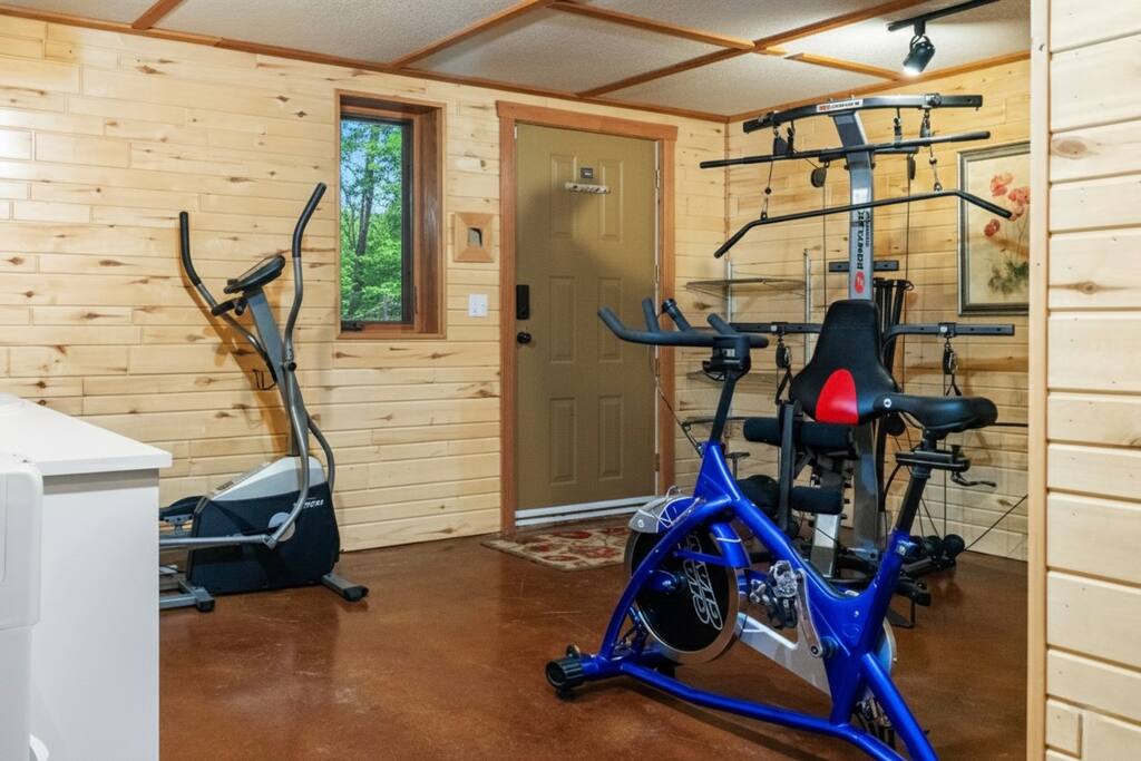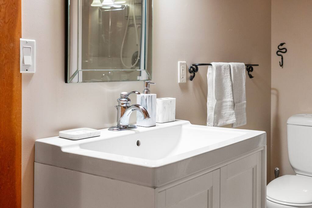 Guests have exclusive access to the entire 3,000 sq ft home, including all 5 bedrooms, 3.5 bathrooms, living areas, family room, fitness room, office spaces, basement with ping pong, hot tub, fire pit, and the surrounding 8 acres of private forested property with direct trail access out the back door.