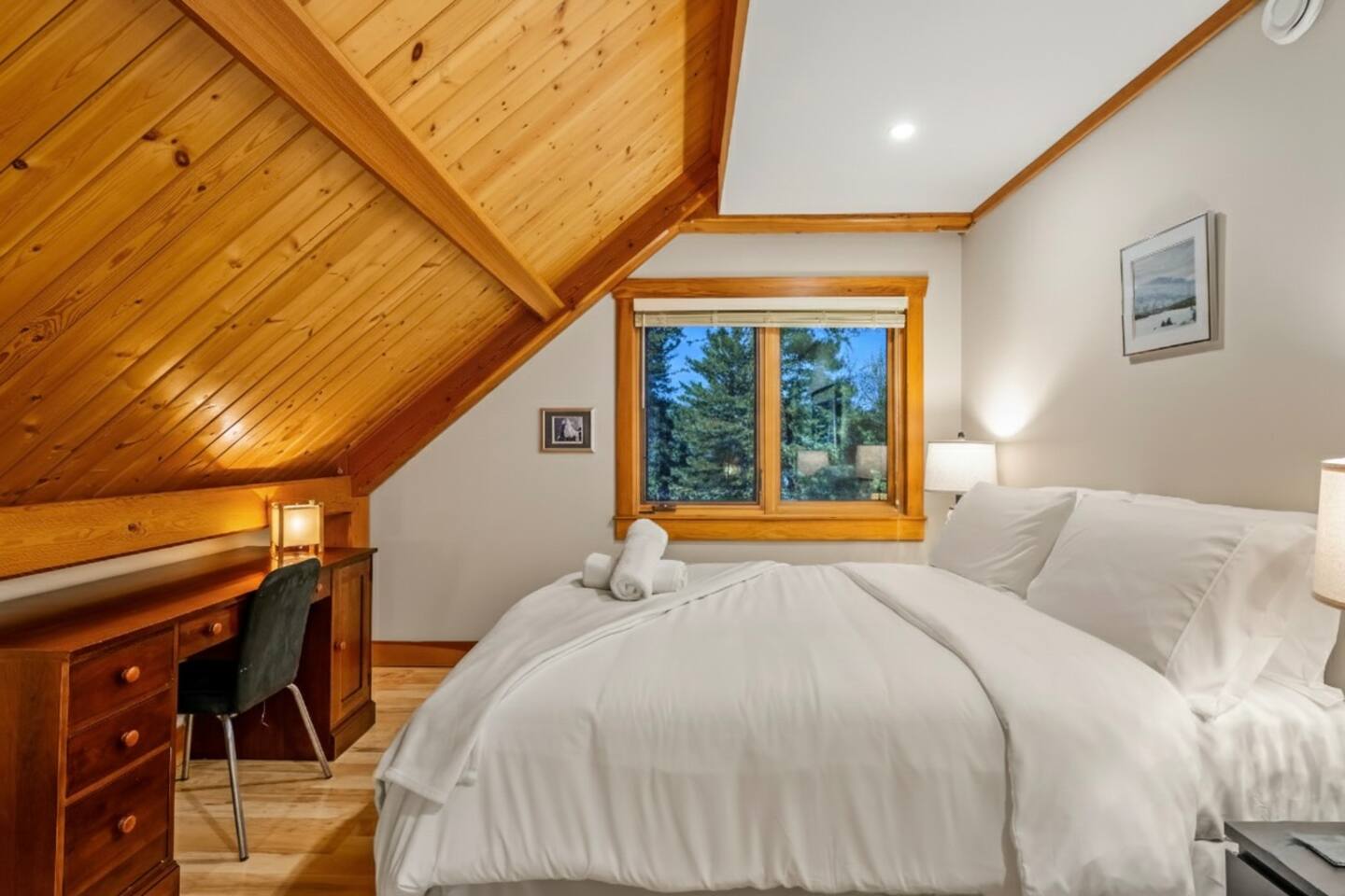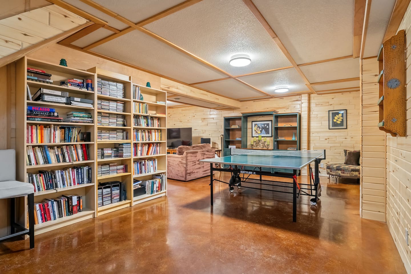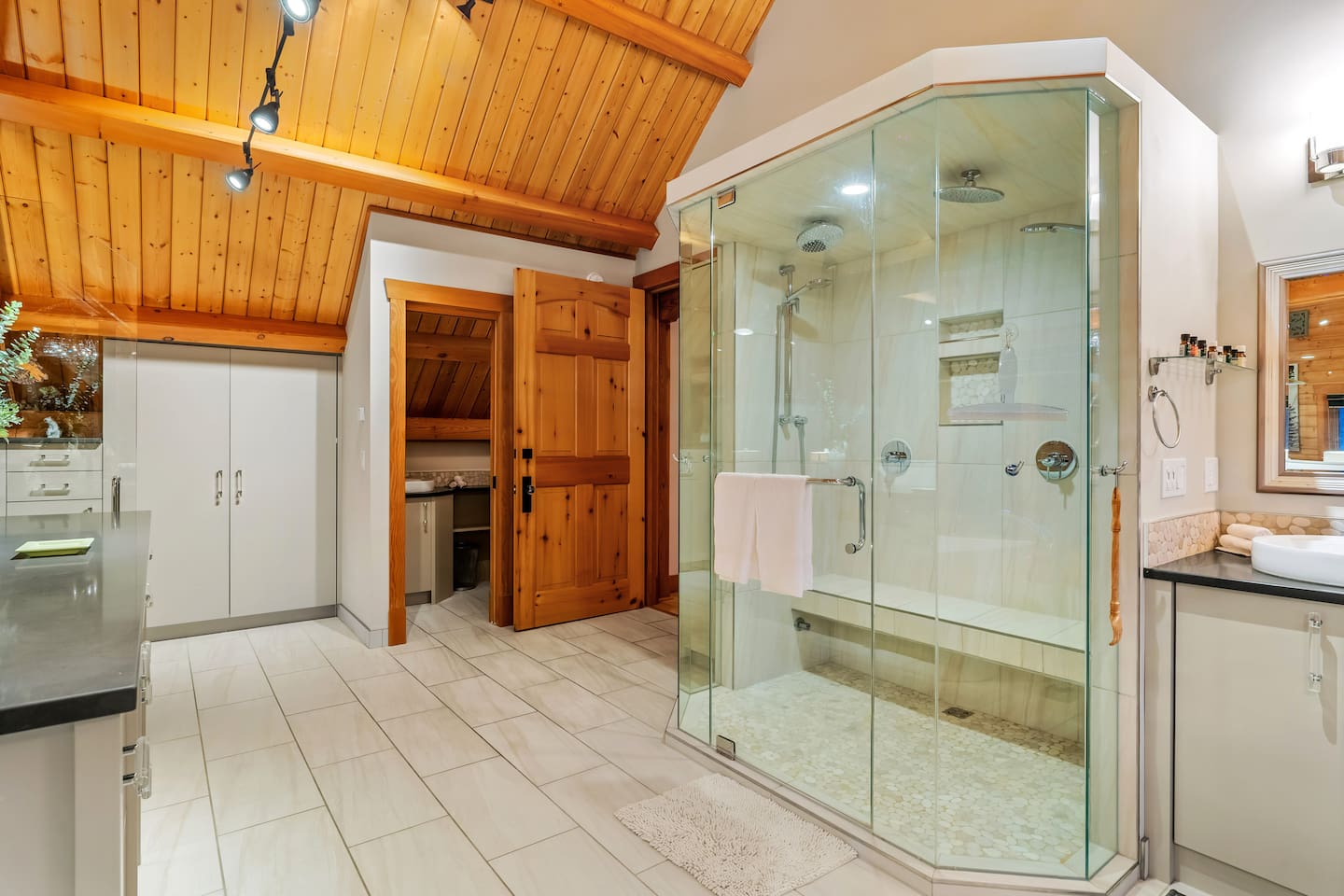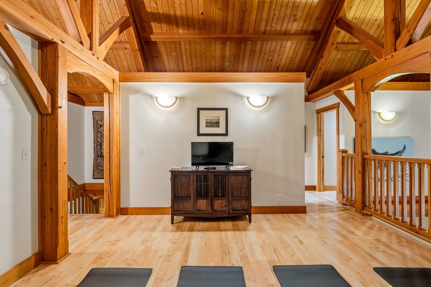 Guests have exclusive access to the entire 3,000 sq ft home, including all 5 bedrooms, 3.5 bathrooms, living areas, family room, fitness room, office spaces, basement with ping pong, hot tub, fire pit, and the surrounding 8 acres of private forested property with direct trail access out the back door.