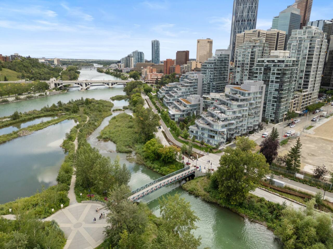 Wake up to stunning river views in the best location Calgary has to offer! This stylish one-bedroom plus den condo is just steps from Prince’s Island Park and the scenic Riverwalk. Work in the dedicated office space, then enjoy a stroll along Calgary’s most beautiful pathway. Enjoy underground parking, A/C, and lounge access. Walk to top dining, Stephen Ave, and Calgary Tower. Your perfect blend of nature, luxury, and downtown energy!